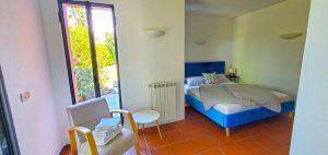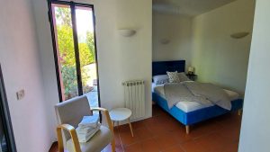 Schlafzimmer (1) (20qm) Doppelbett (180×90), prof. Moscitoschutz an Tür und Fenster, Deckenventilator, Radio, eigener Badzugang
