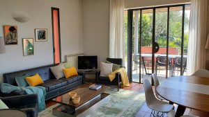 Küche voll ausgestattet, mit 5 Flammen-Herd, Gas-Backofen, Groß-Kühlschrank, Geschirrspülmaschine, Nespresso-Kaffeemaschine, Filter-Kaffeemaschine, Toaster, Wasserkocher und einem Esstisch.